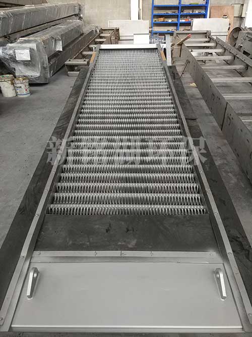 按水流方向耙齿链类似于格栅,在耙齿链轴上装配流水线的耙齿间隙可以根据运用规范进行选择。当耙齿把流体动力学中的固态固体提取后可以确保水流顺畅越过。所有工作上整个过程是不断的,还能够是间断性的。